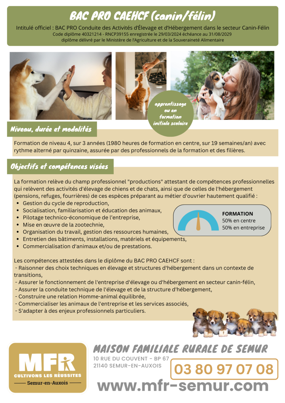 – en organisant des forums d’orientation au CFA MFR de Semur en Auxois : table ronde avec nos anciens diplômés, représentants tous les métiers de la filière chien/chat et solutions de poursuite de parcours (métiers de la défense, de la police, de la sécurité, de la prévention, de l’assistance…).