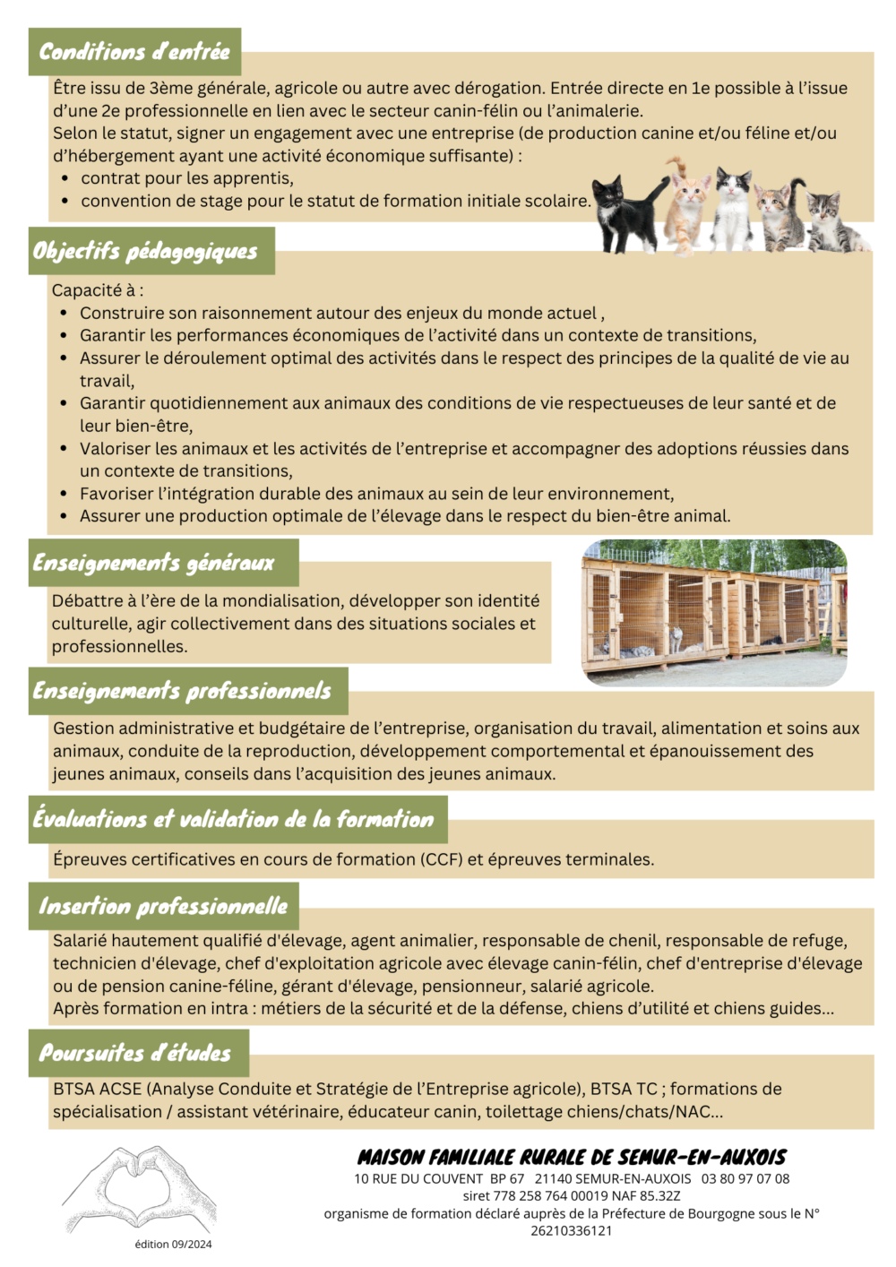 La MFR de Semur en Auxois inscrit ses actions dans ce double objectif de formation des jeunes et de professionnels. Pour se faire, la MFR développe des relations partenariales dans le domaine canin et félin et a ainsi mis en place des formations courtes à destination des éleveurs
