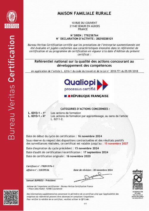 Depuis le 16 novembre 2020, nous sommes certifiés pour :